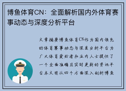 文章摘要:博鱼体育CN作为国内领先的体育赛事动态与深度分析平台,为广大体育爱好者和业内人士提供了一个全面、准确且实时更新的资讯平台。本文将从四个方面深入剖析博鱼体育CN的独特优势和功能。首先,平台在赛事信息的更新与准确性方面具有显著优势,能够及时传递全球范围内的各类体育赛事动态;其次,博鱼体育CN通过多角度的赛事数据分析,提升了用户对赛事的洞察力与预测能力;再次,平台在用户互动与社区建设方面的创新,促进了体育迷之间的交流与讨论;最后,博鱼体育CN的未来发展趋势展望,揭示了其在体育行业中的重要角色与潜力。本文将全面解析博鱼体育CN在现代体育资讯传播中的价值与影响,帮助读者更好地理解这一平台在全球体育产业中的作用。